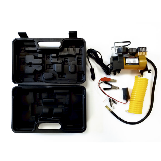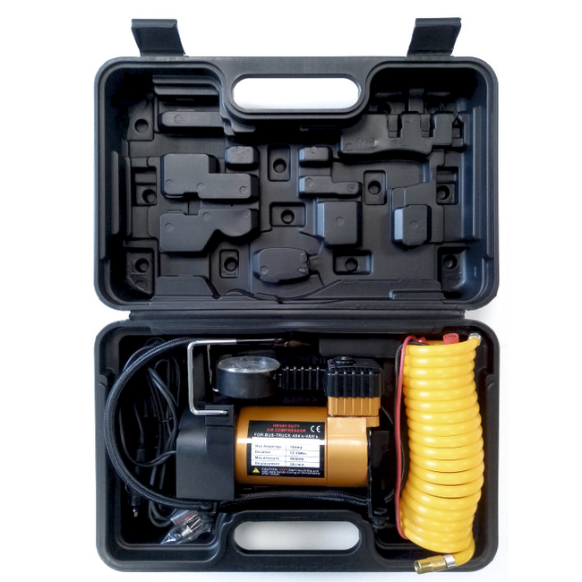Металлический мощный (85 литров в минуту) автомобильный компрессор для большинства шин автомобилей, в том числе минивэнов, джипов и аналогичной техники. Алюминиевый радиатор поршня не позволит перегреться и заклинить в процессе работы. Два поршня обеспечивают высокую мощность и скорость накачки шины. Рекомендовано подключать этот компрессор напрямую к аккумулятору гнездом из набора. Это обусловлено высокой мощностью прибора и как следствие, при неплотном контакте может возникнуть нагрев гнезда прикуривателя в автомобиле. Входящие в набор 3 адаптера позволят накачать не только колеса, но и футбольный, волейбольный и баскетбольные мячи, колеса колясок и садовых тачек, а также все соответствующие по диаметру надувные предметы. Встроенный манометр позволит контролировать процесс накачки и не даст создать лишнее давление Не предназначен для накачивания шин грузовой крупнотонажной автомобильной техники. Специальные, амортизирующие эластичные ножки делают работу компрессора не слишком шумной. Удобная ручка на корпусе для переноски и крепкая чехол-сумка для хранения прибора завершат описание этого чудо набора.