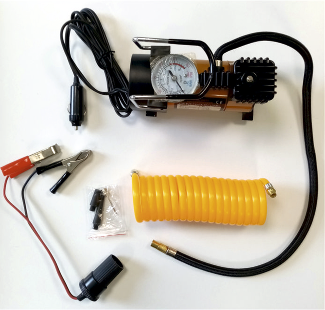 Компрессор с шнуром питания 12В, гнездо-прикуриватель с клеммами, шланг удлинения, сумка, 3 переходника. |